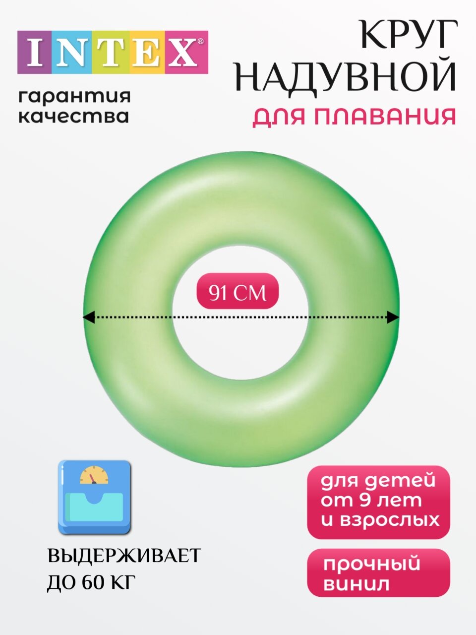 Круг надувной неон 91 см до 60 кг Цвет Зелёный INTEX 59262_GN