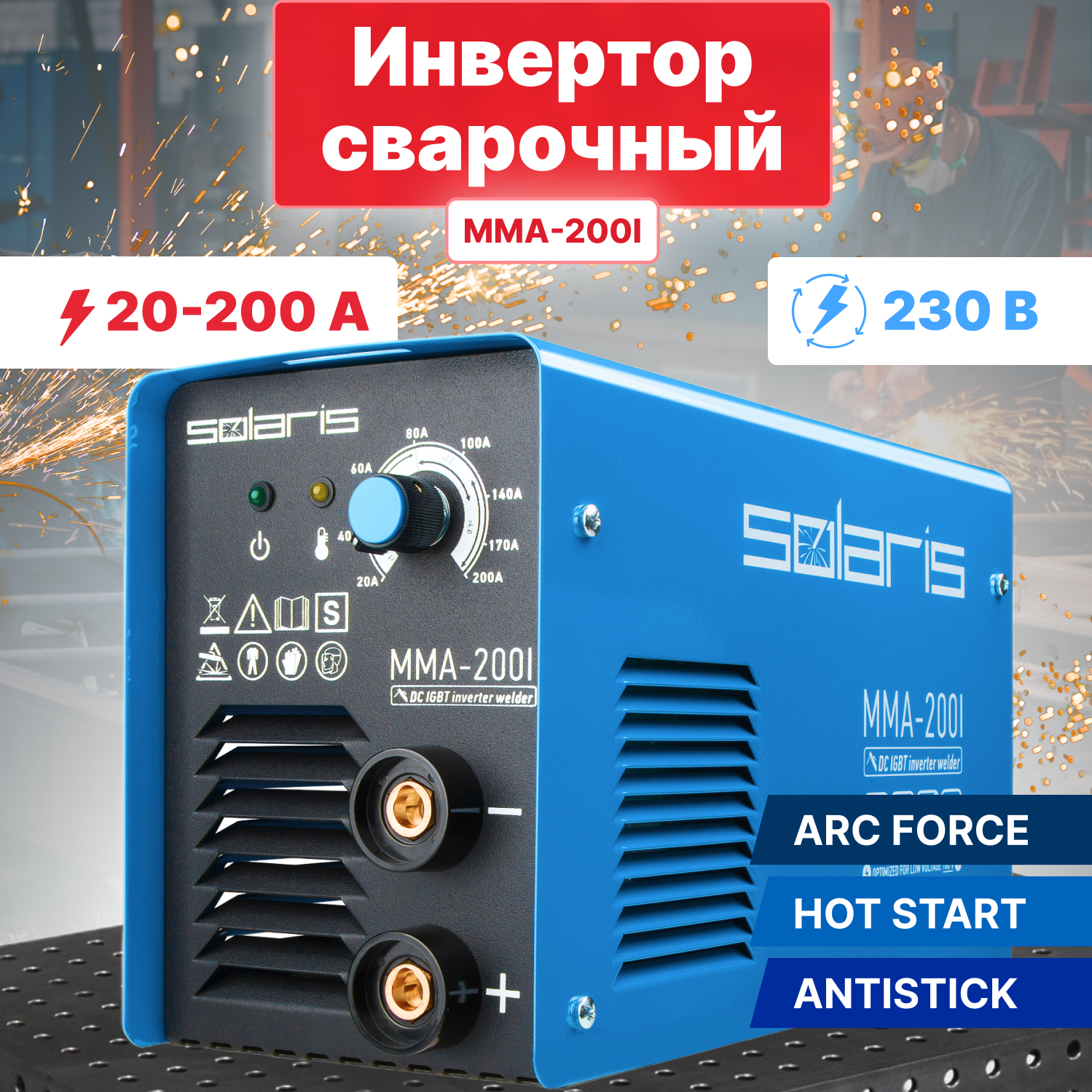 Купить Инвертор сварочный SOLARIS MMA-200I (230В, 20-200 А, 70В, электроды диам. 1.6-4.0 мм, вес 3.4 кг)