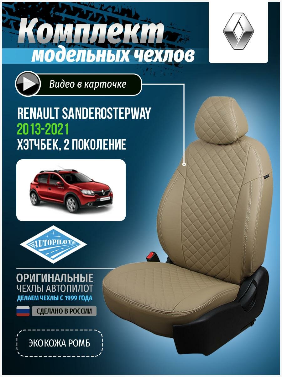 Авточехлы для Renault Logan, Sandero Stepway 2 2013-2020 Автопилот Темно-Бежевый Экокожа с ромбом re-sd-s14-tbtb-r
