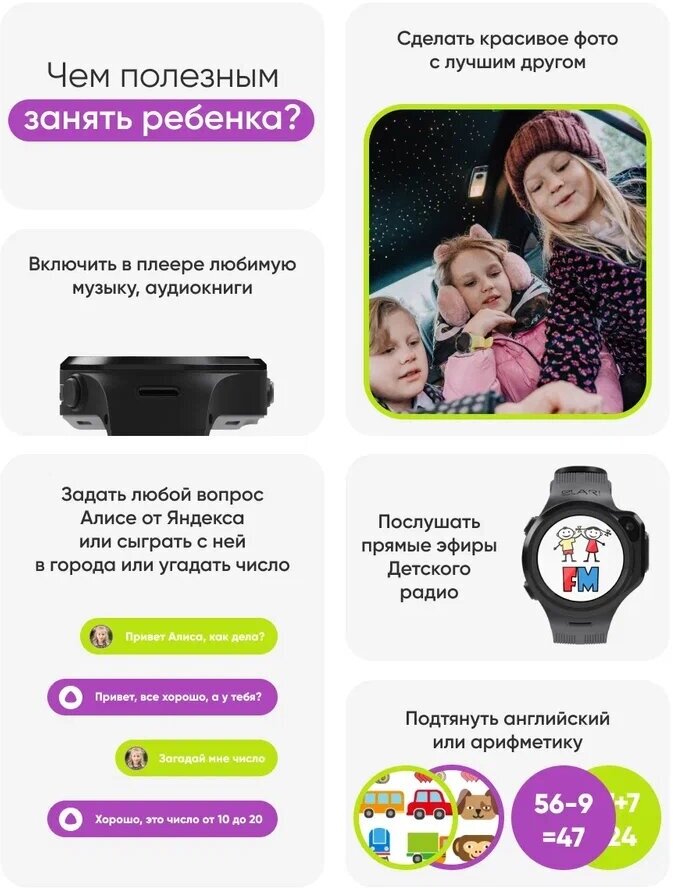 Однозначно это лучшие часы из всех!!! 1. Любимейшая встроенная Алиса! 2. Фотографии (можно ооочень много сделать). 3. Переписка в чате (родители могут и длинные сообщения писать, и фото добавлять). 4. Будильник!!! 5. Встроенная музыка (закачал кучу любимых песен ребенка и ребенок рад). |