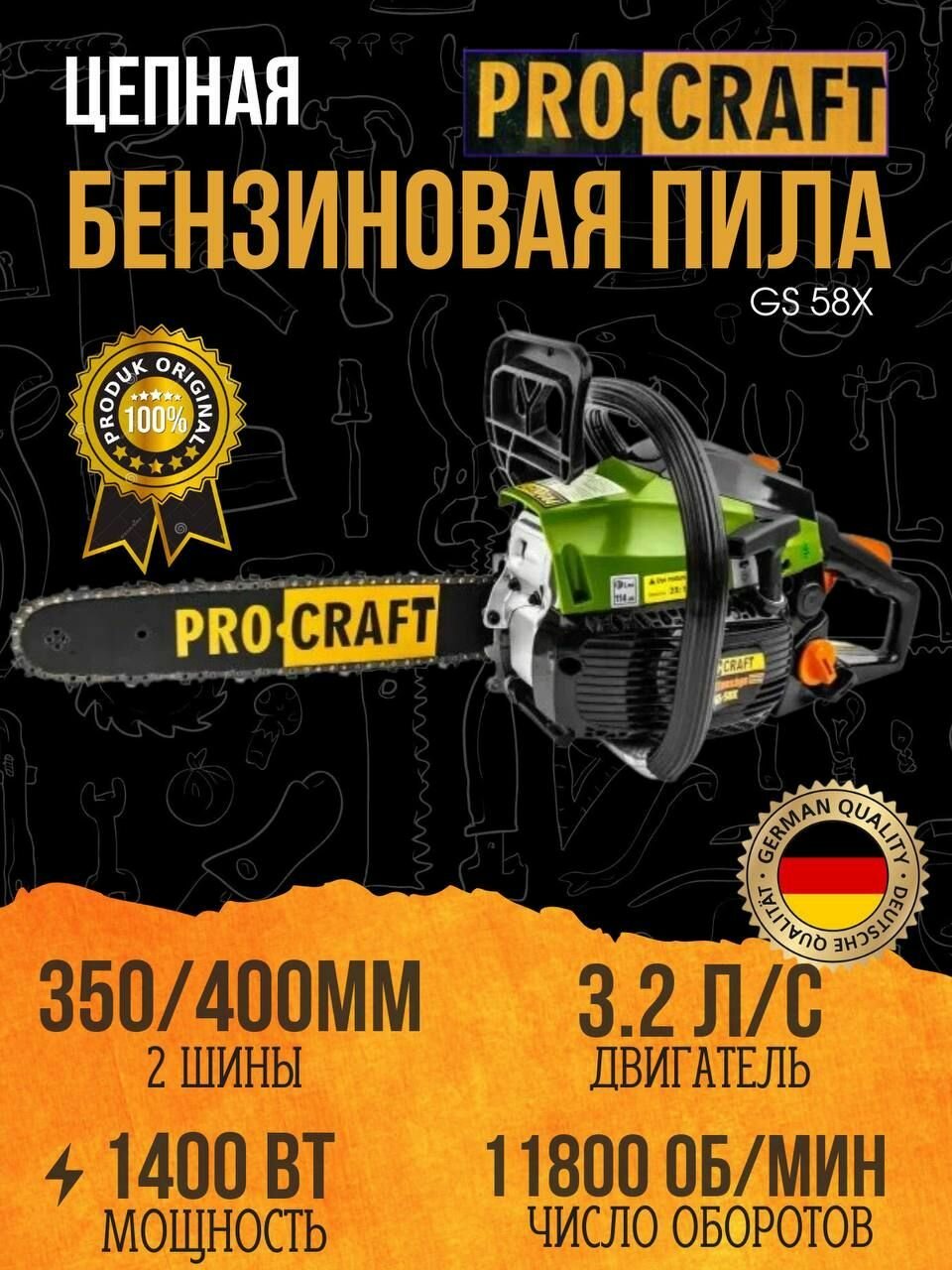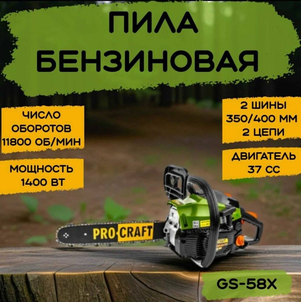 Пила цепная бензиновая Procraft GS-58 X (2 шины 350/400мм, 2 цепи), 3.2 л/с, 1400Вт, 11500 об/мин интересное:
