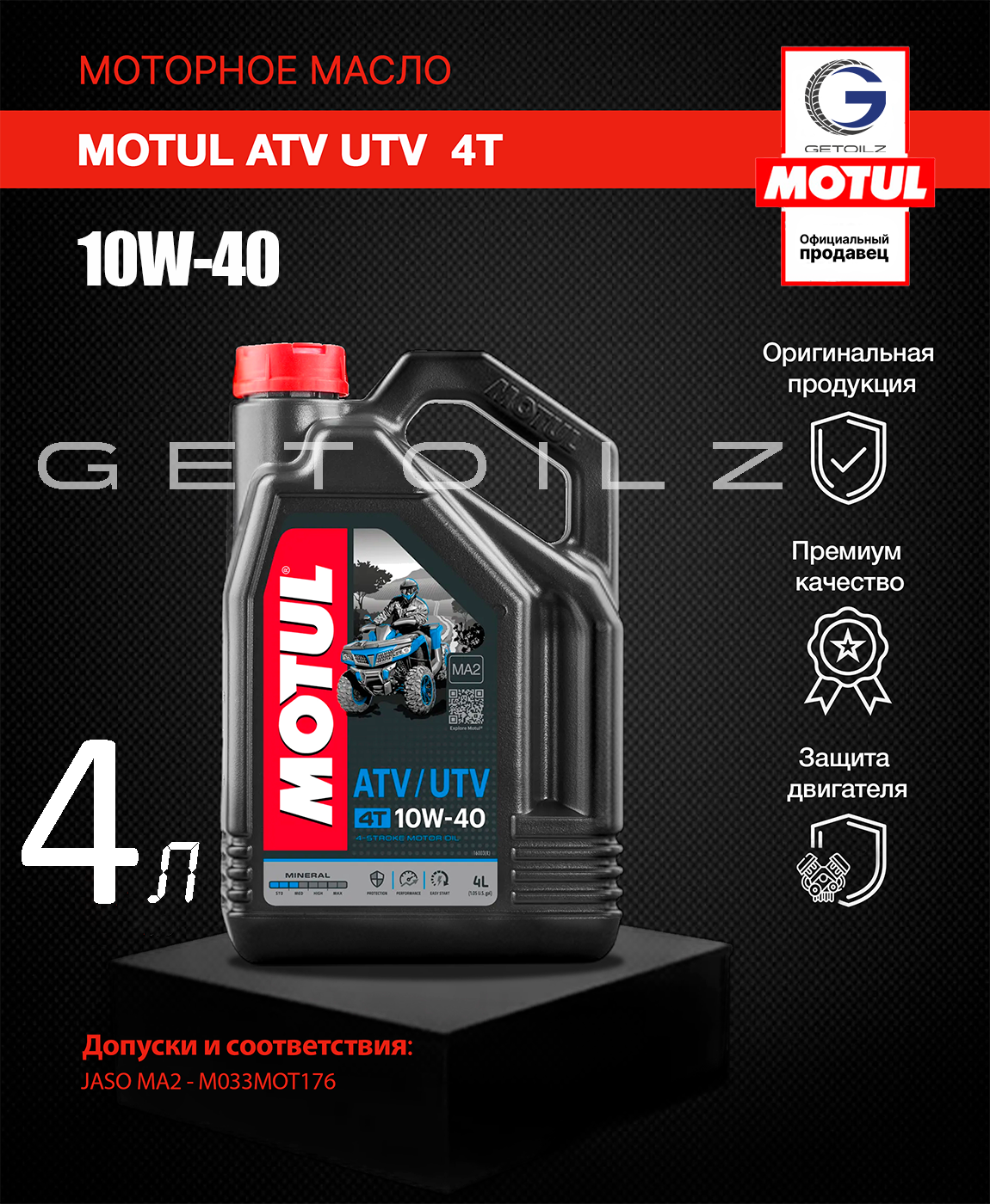 Масло для квадроциклов MOTUL ATV UTV 4T 10w40 минеральное, API SL, JASO MA, 4-тактное, 4л, арт. 105879
