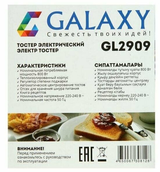 Тостер Galaxy GL 2909 (800Вт, белый, автоматическое центрирование тостов) интересное: