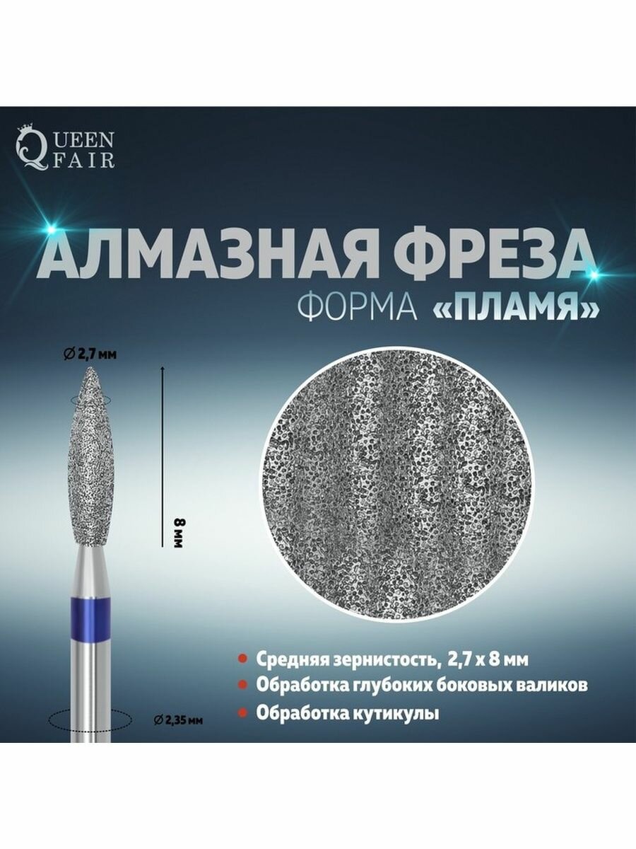 Queen fair Фреза алмазная для маникюра «Пламя», средняя зернистость, 2,7 × 8 мм, в пластиковом футляре
