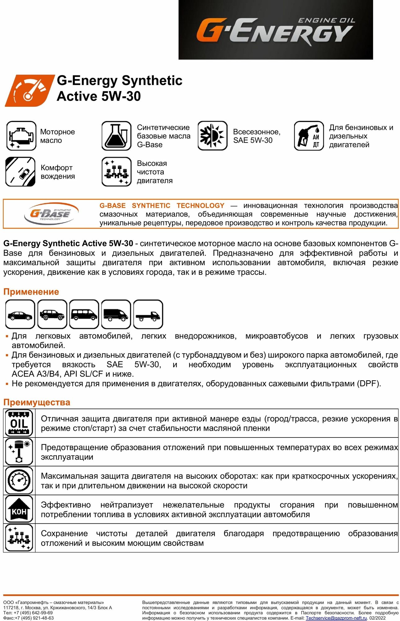 GAZPROMNEFT 253142405 масо G-ENERGY SYNTHETIC ACTIVE 5W30 4