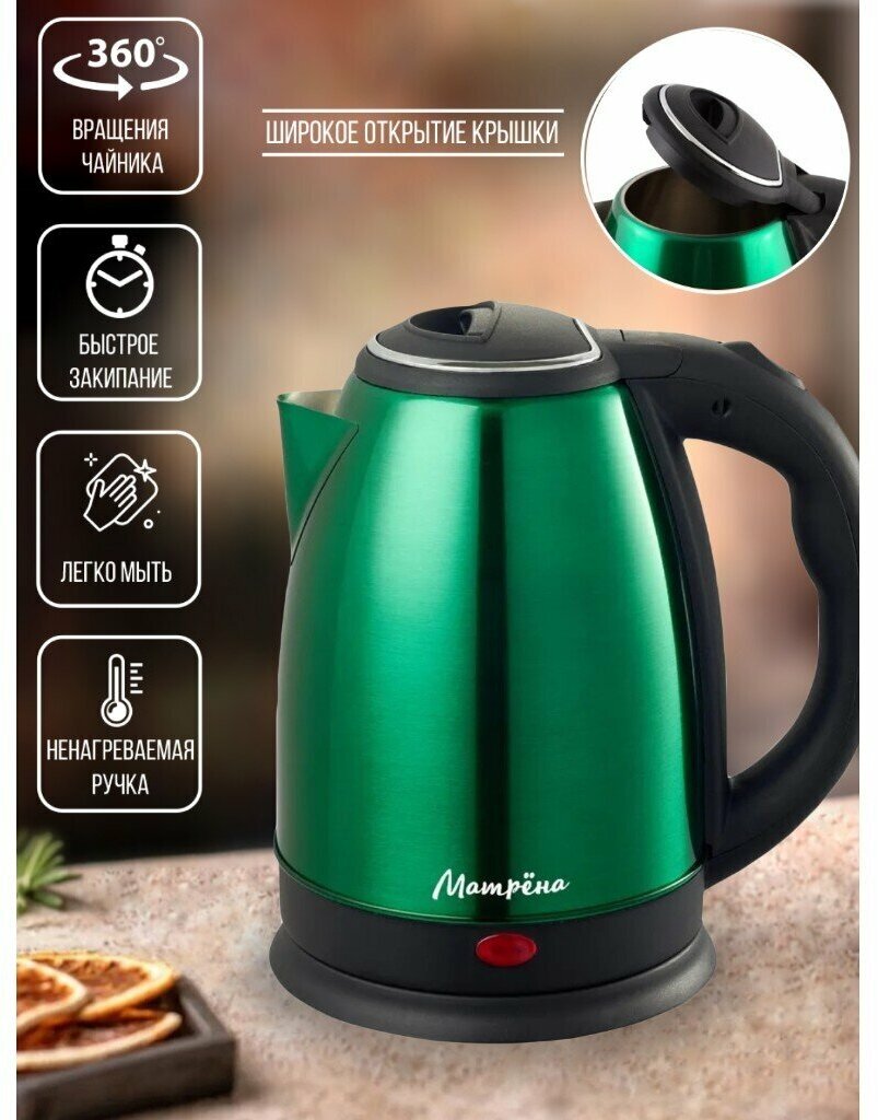 Матрёна Чайник электрический матрёна MA-002, металл, 1.8 л, 1500 Вт, зелёно-чёрный