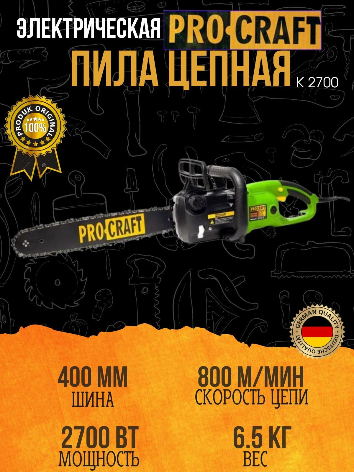 Купить Пила цепная электрическая Procraft K2700 (1 шина, 1 цепь 400мм), 2700Вт, 800м/мин