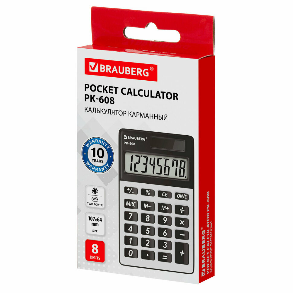 Калькулятор карманный BRAUBERG PK-608 (107x64 мм), 8 разрядов, двойное питание, серебристый, 250518 (цена за 1 ед.товара)