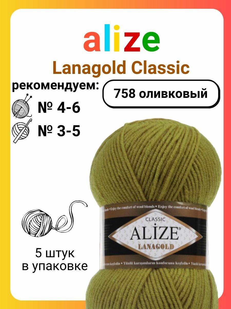 Купить Пряжа Alize Lanagold (Ализе Ланаголд) - 5 мотков 758 оливковый 49% шерсть, 51% акрил 240м/100г