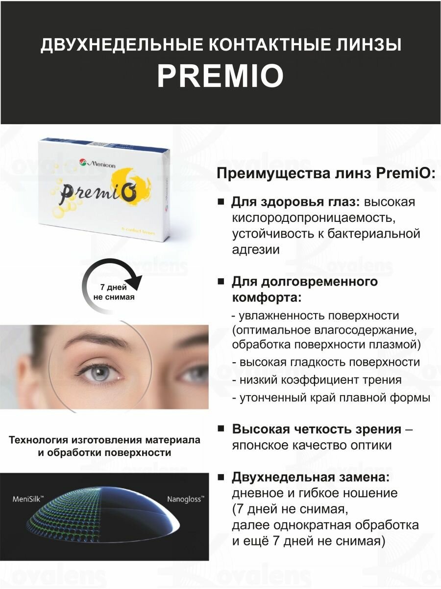 PremiO Японские линзы +0.25, Диаметр 14.0, Кривизна 8.6, 6 штук (линз), двухнедельные контактные. (Премио Меникон). Срок замены линзы - 2 недели