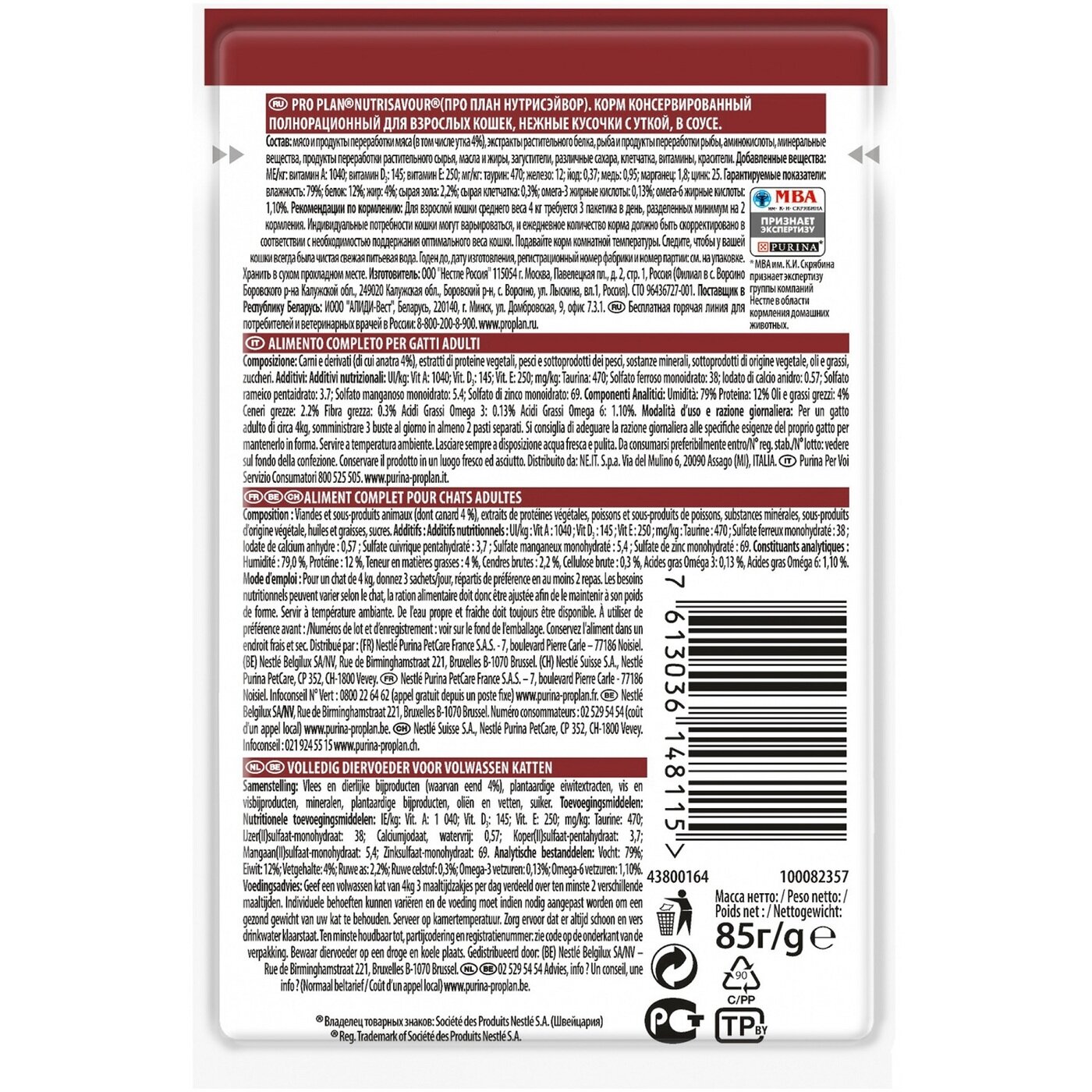 Влажный корм Pro Plan для взрослых кошек, с уткой в соусе, паучи, 85г.*12шт.