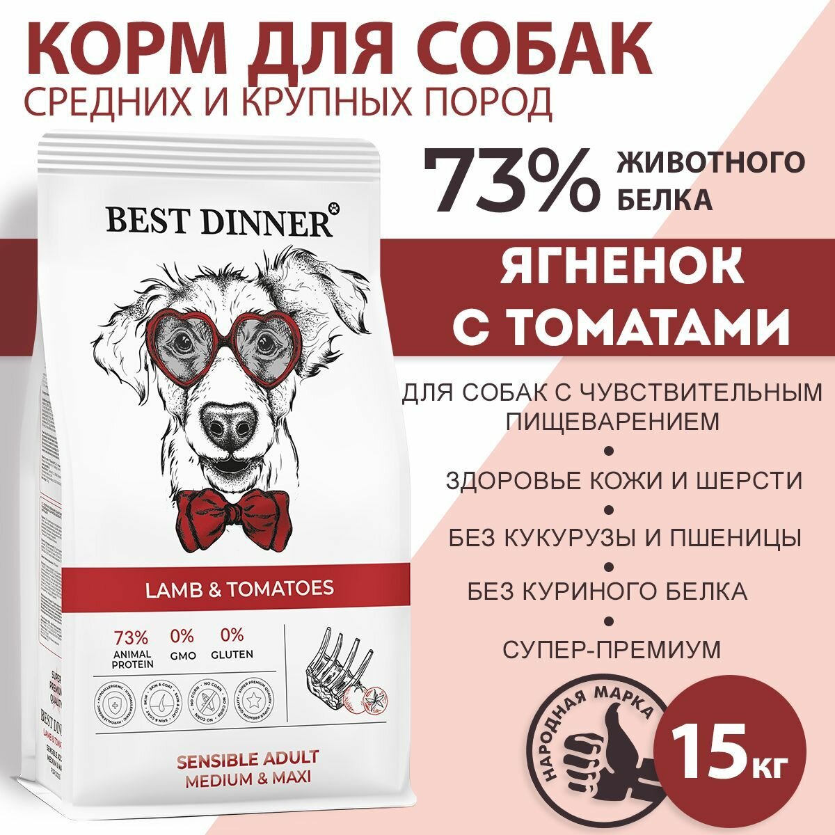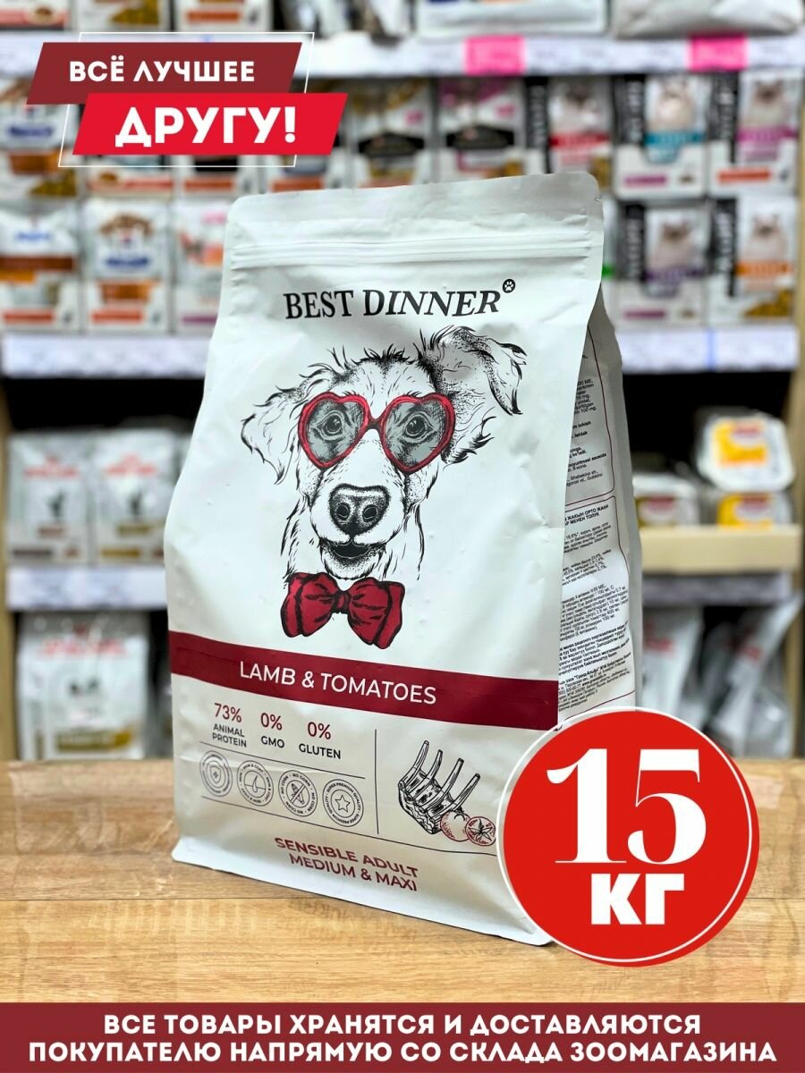 Купить BEST DINNER DOG ADULT MEDIUM & MAXI SENSIBLE для взрослых собак средних и крупных пород с чувствительным пищеварением с ягненком и томатами (15 кг)