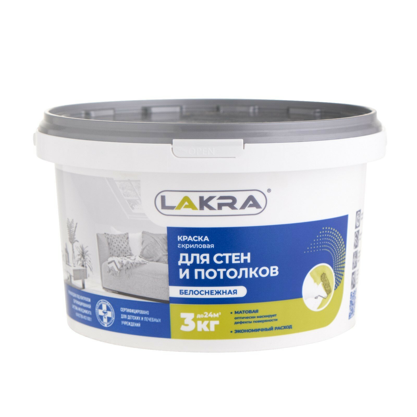 Краска акриловая лакра для стен и потолков влагостойкая 3кг белоснежная, арт.8306463