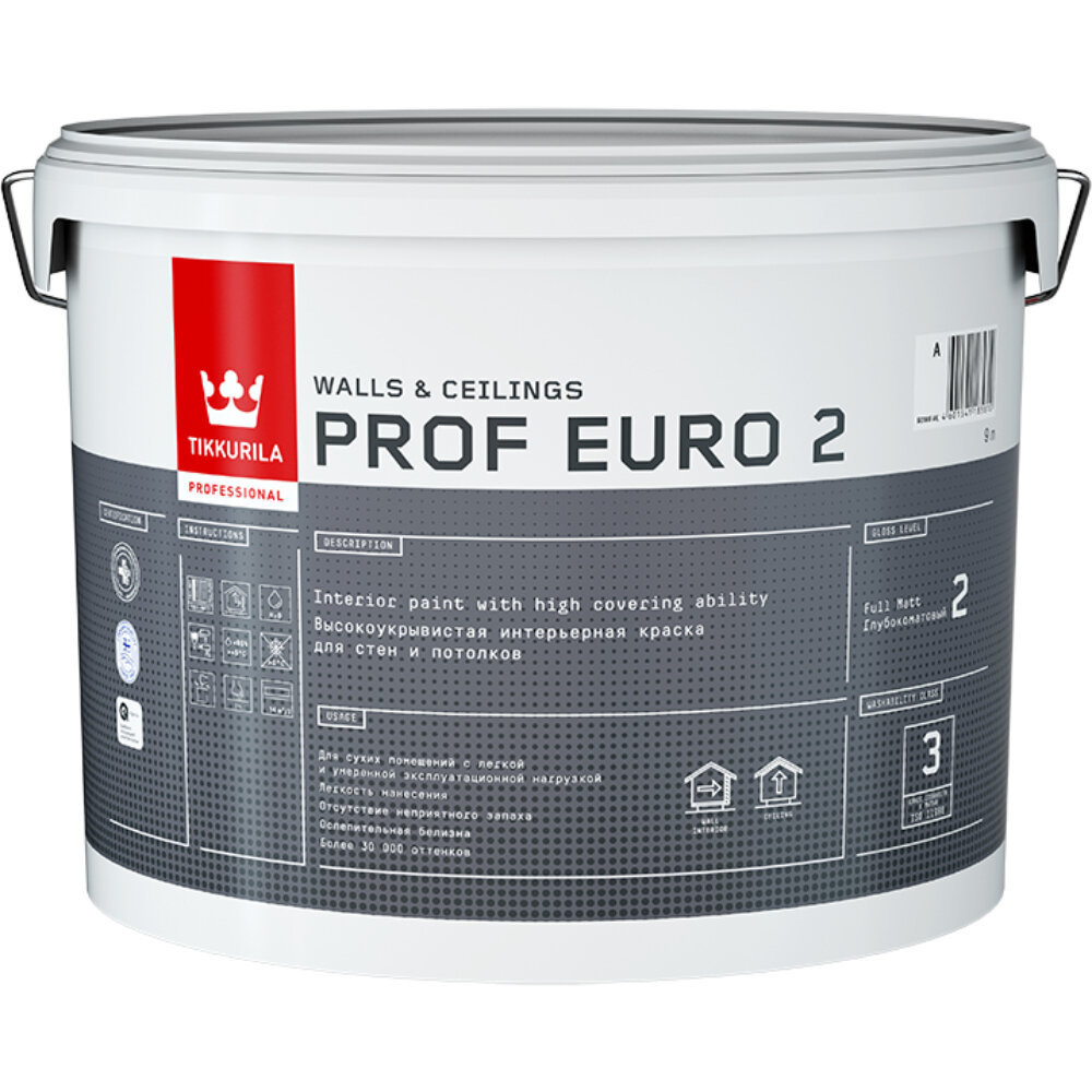 Tikkurila Prof Euro 2 Профессиональная водоразбавляемая краска для стен и потолков,база А,2,7 л