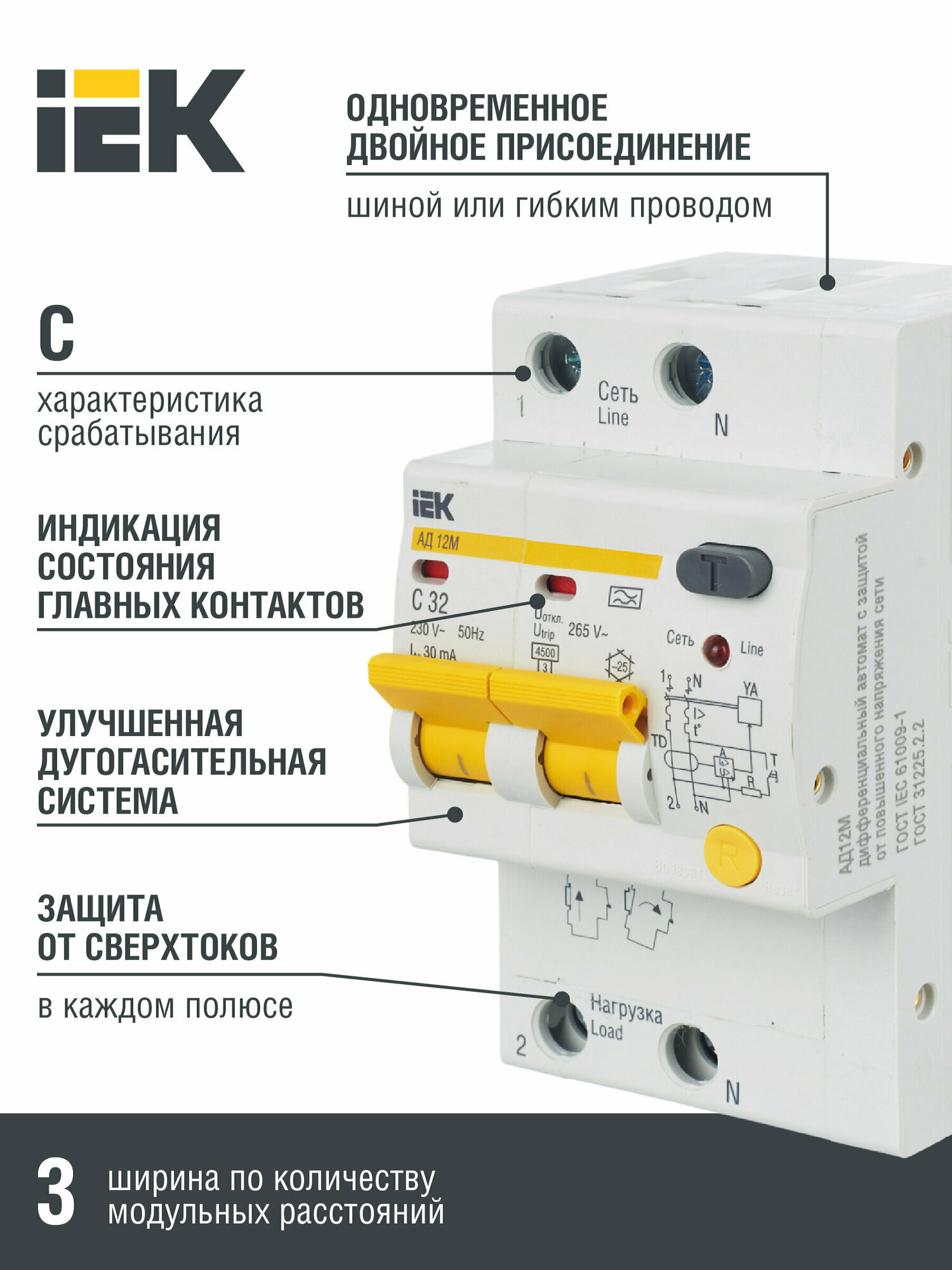 Выключатель автоматический дифференциальный АД12М 2п 32А C 30мА тип A (3 мод) MAD12-2-032-C-030 IEK
