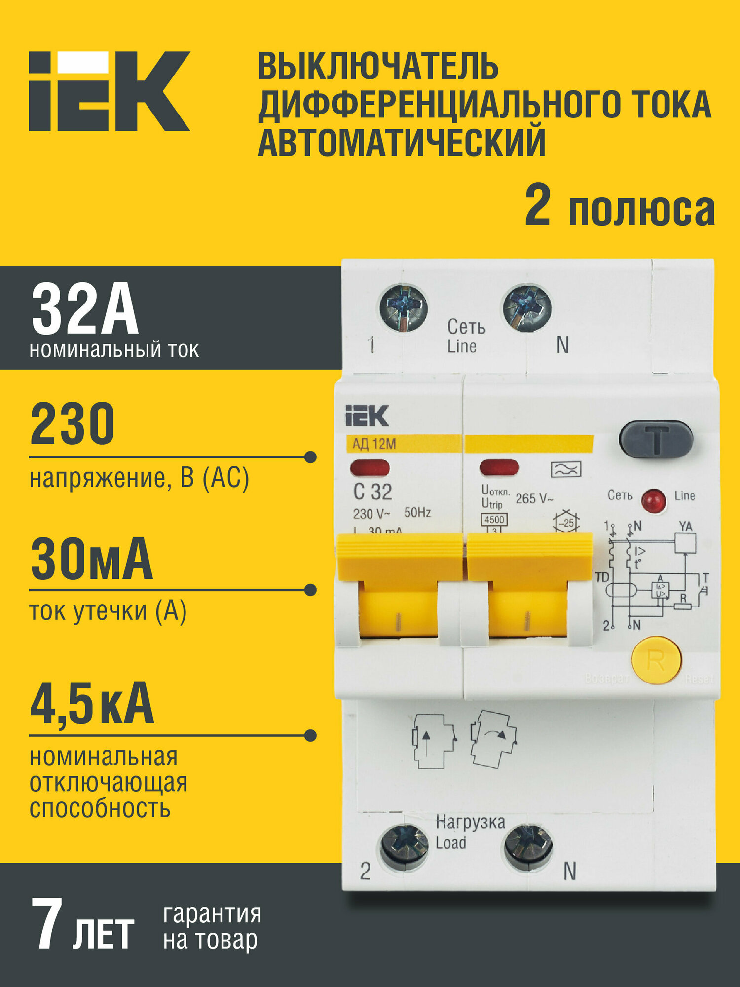 Выключатель автоматический дифференциального тока 2п C 32А 30мА тип A 4.5кА АД-12М, IEK MAD12-2-032-C-030 (1 шт.)
