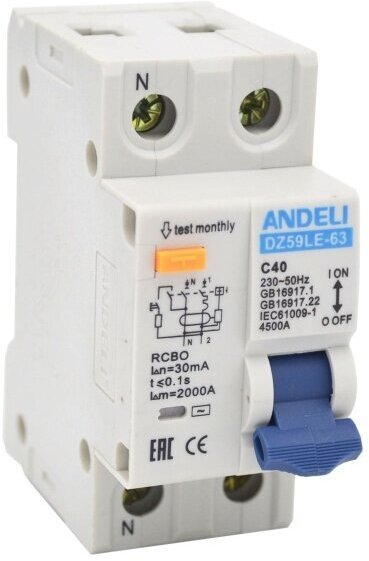 Дифференциальный автоматический выключатель Andeli, DZ59LE-40 (1P+N), 20 А, 30 мА, 4,5 кА