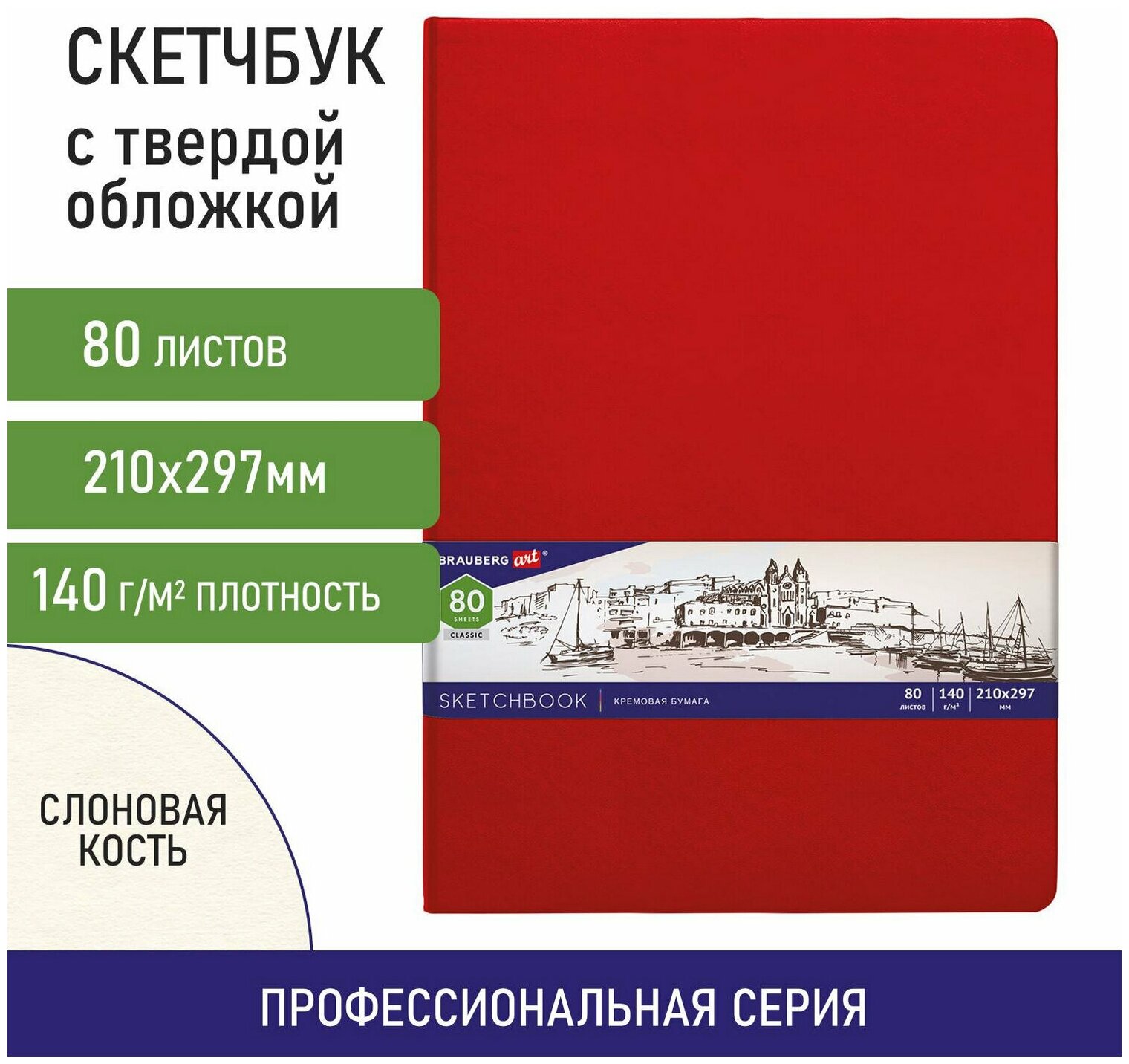 Скетчбук, слоновая кость 140 г/м2 210х297 мм, 80 л., кожзам, резинка, BRAUBERG ART CLASSIC, красный, 113199 - 1 шт.