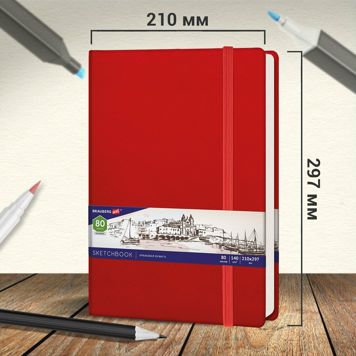 Скетчбук Brauberg Art Classic, слоновая кость, 140 г/м2, 210х297 мм, 80 л., кожзам, резинка, красный