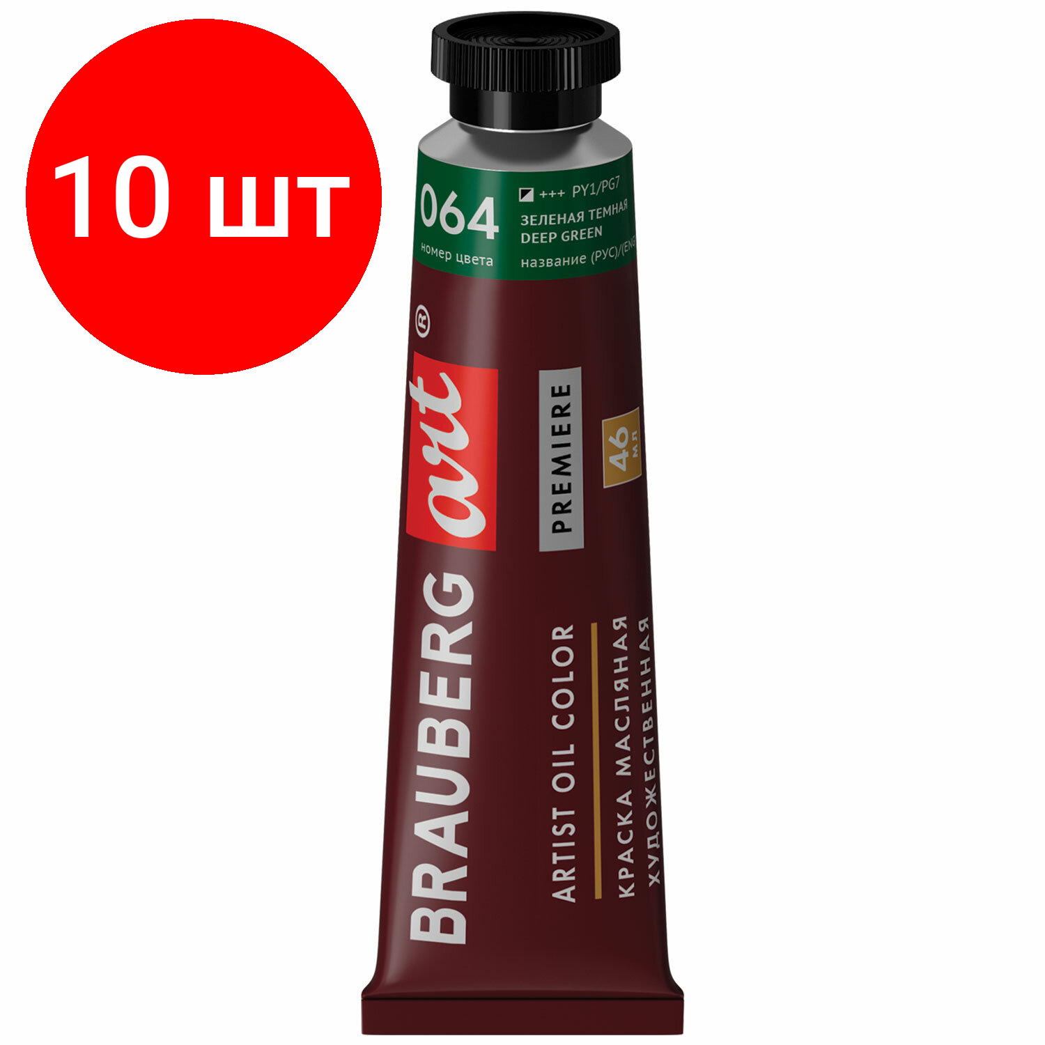 Комплект 10 шт, Краска масляная художественная BRAUBERG ART PREMIERE, 46 мл, проф. серия, красная прочная, 191449