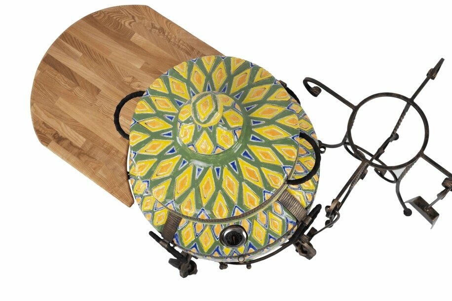 ЭкоТандыр Восточный с откидной крышкой и поддувала, на колесах и 1 деревянным столом интересное: