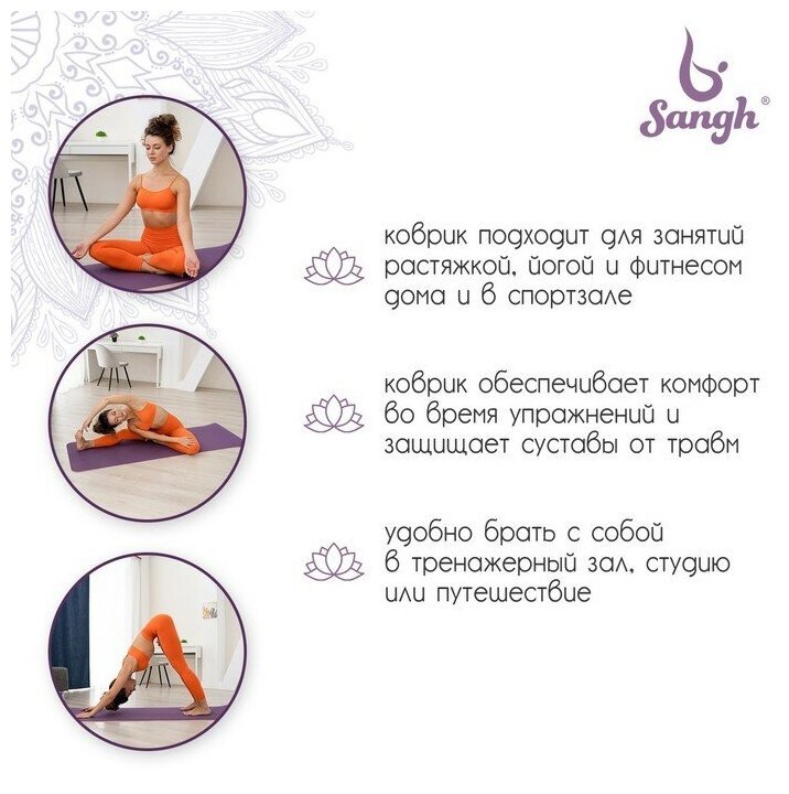 Коврик для йоги Sangh, нескользящий, 183×61×0.6 см, цвет сиреневый