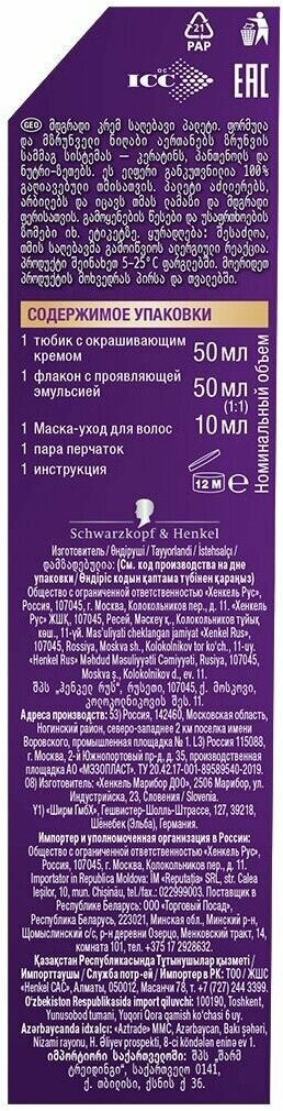 | Отзыв: | В состав краски входит тюбик с самой крем-краской, проявляющая эмульсия, перчатки, маска для ухода за волосами после окрашивания и инструкция.