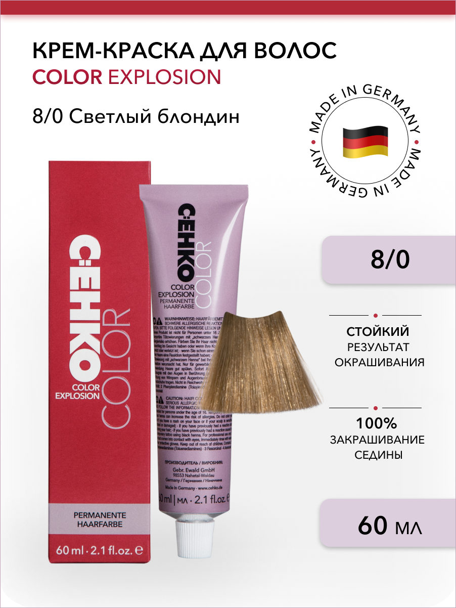 Профессиональная краска для волос 8/00 Светлый блондин, интенсивный, русый, натуральный, стойкая, для седых волос, 60 мл, C:EHKO COLOR EXPLOSION