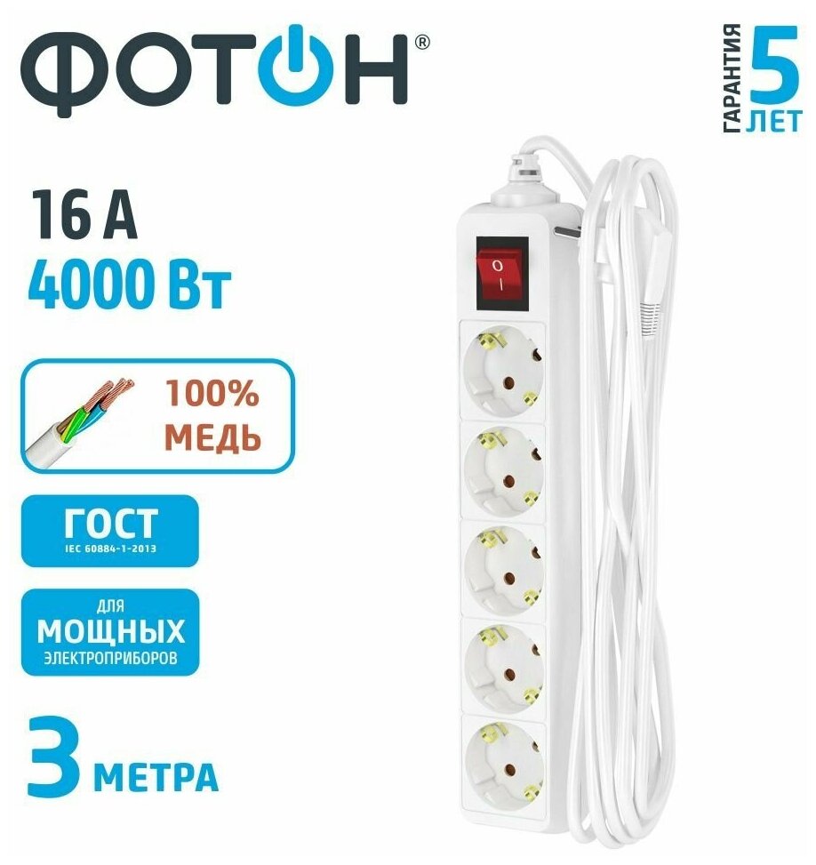 Фотон Удлинитель сетевой 16-35ЕS, 3м, 5 розеток, 16А, с выключателем, с заземлением, Белый 21208
