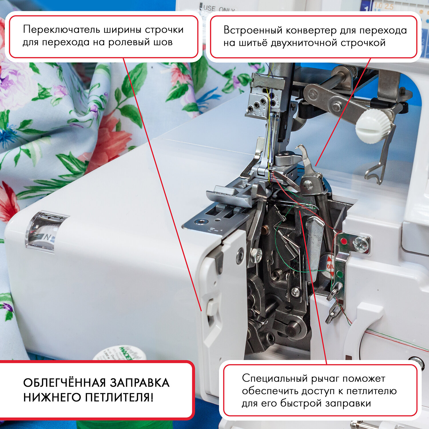 | Дополнительные функции | отключение ножа, регулировка ширины обреза ткани, заправщик нижнего петлителя, стабилизатор силы прокола, дифференциальная подача, автоматическая заправка иглы, регулировка прижима ткани |
