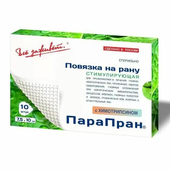 Повязка ПараПран атравматическая, очищающая с Химотрипсином, 7,5см х 10см - 10шт