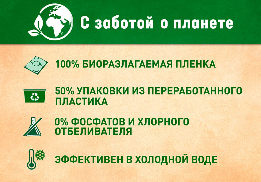 | Способ применения | 1 капсула для 4-5 кг белья и воды любой жесткости. 3 капсулы для сильных загрязнений, жесткой воды, > 7 кг белья. Положите капсулу в барабан стиральной машины, загрузите белье, начните стиркку. |