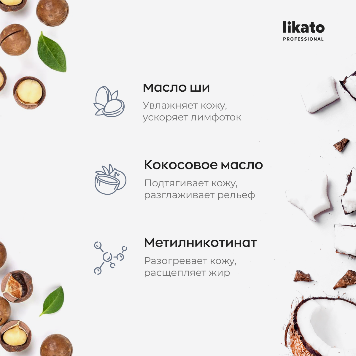 | Масла и экстракты | масло кокоса / масло ши (карите) |