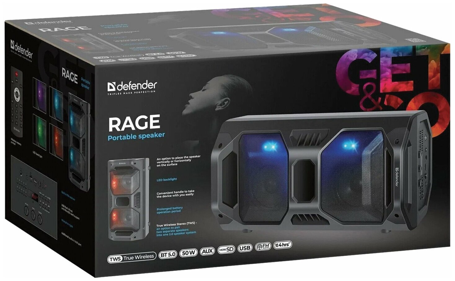 Портативная акустика Defender Rage 50Вт, Light/BT/FM/USB/LED/TWS (65109)
