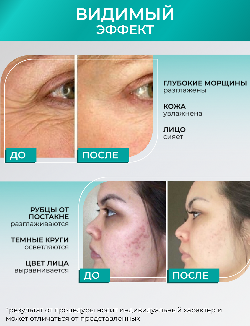 | Эффект | осветление пигментных пятен / повышение упругости кожи / подтяжка кожи / разглаживание морщин / сужение пор / удаление рубцов и шрамов / улучшение кровоснабжения / уменьшение жировых отложений / устранение отеков |