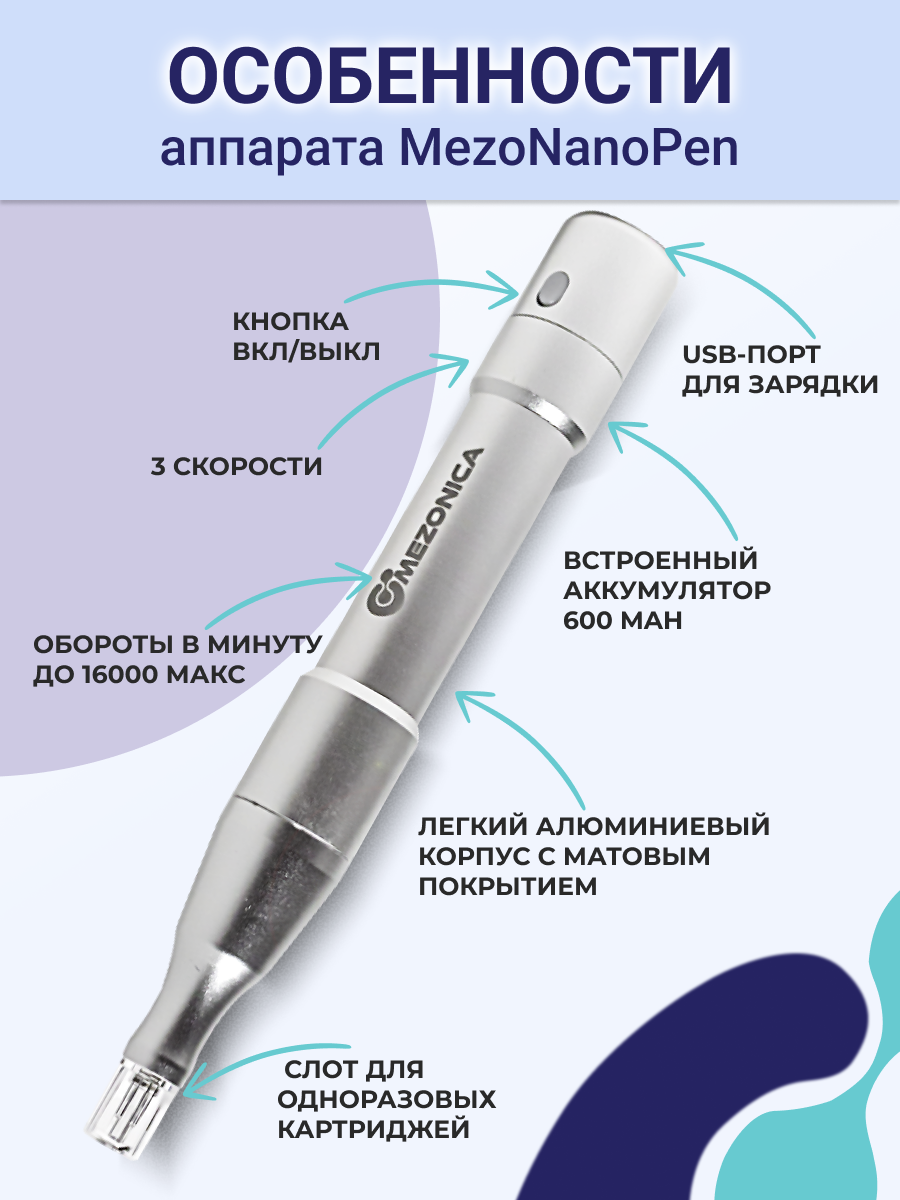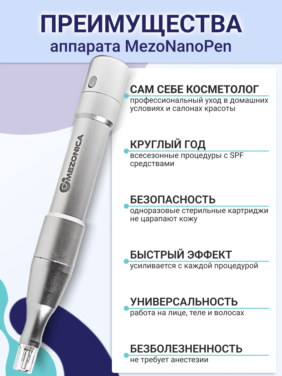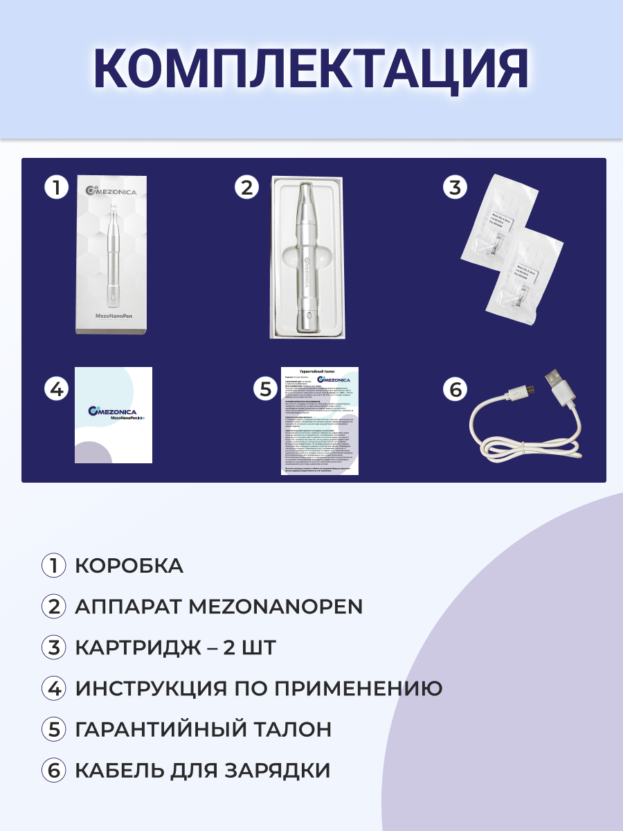 | Комплектация | Устройство MezoNanoPen 1 шт., картридж 2 шт., инструкция на русском языке, USB-кабель, гарантийный талон. |