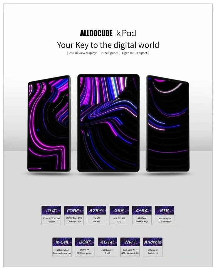 Планшет Alldocube Kpad T1026 Grey (Spreadtrum T610 1.8 GHz/4096Mb/64Gb/LTE/Wi-Fi/Bluetooth/Cam/10.36/2000x1200/Android) интересное: