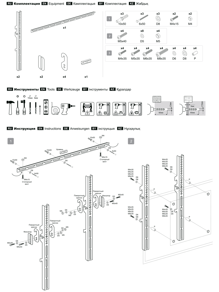 | Плюсы: | Простой и прочный.Есть необходимый крепеж и форнитура (пластковые втулки очень пригодились) есть пузырек уровня в комплекте . |