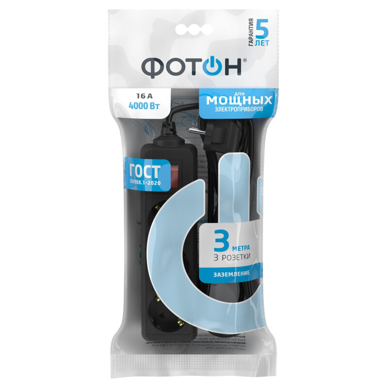 Удлинитель сетевой для розетки фотон 16А 3 метра 3 розетки с выключателем с заземлением черный, ГОСТ