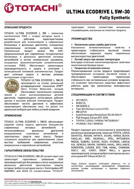 Масло моторное Totachi Ultima EcoDrive L 5w30 синтетическое, SN/CF, ACEA C3, универсальное, 4л, арт. 4562374690929/12104