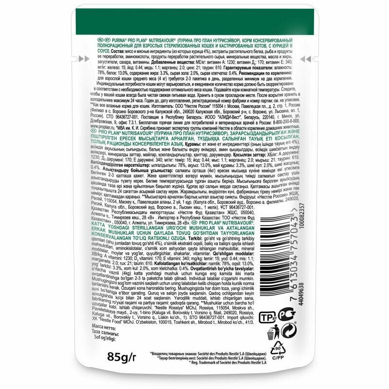 Purina Pro Plan (паучи) Паучи Кусочки в соусе для кастрированных кошек с курицей (Sterilised) 1224943212457365 | Sterilised 0,085 кг 24410 (2 шт)