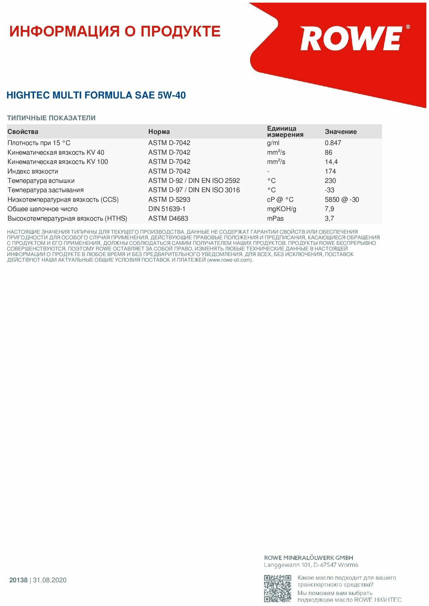 ROWE 20138-0010-99 Синтетическое моторное масло HIGHTEC MULTI FORMULA SAE 5W-40 1л.