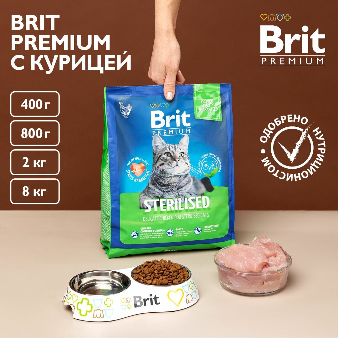 Корм сухой для взрослых кошек BRIT Premium Cat Sterilized с курицей, для кастрированных и стерилизованных, 800г