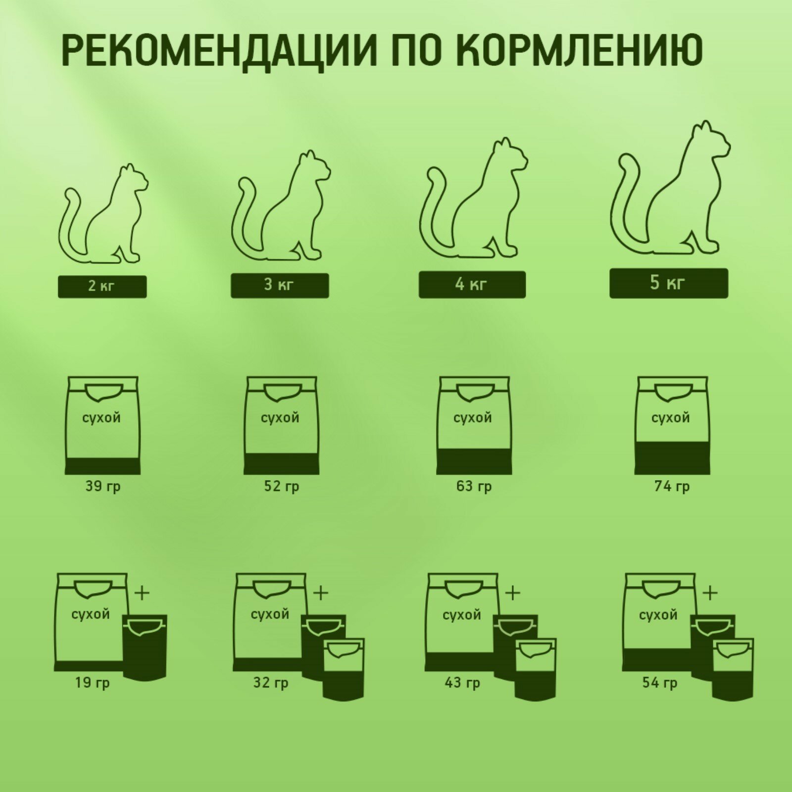 | Дозировка | - вес кошки 2 кг – 39 г; - вес кошки 3 кг – 52 г; - вес кошки 4 кг – 63 г; - вес кошки 5 кг – 74 г |