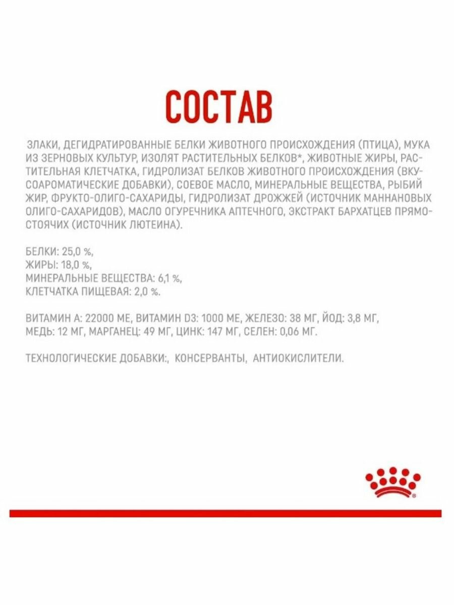 | Состав | злаки, дегидратированные белки животного происхождения (птица), мука из зерновых культур, изолят растительных белков, животные жиры, растительная клетчатка, гидролизат белков животного происхождения (вкусоароматические добавки), соевое масло, минеральные вещества, рыбий жир, фрукто-олиго-сахариды, гидролизат дрожжей (источник маннановых олиго-сахаридов), масло огуречника аптечного, экстракт бархатцев прямостоячих (источник лютеина) |