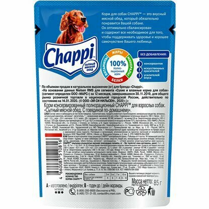 Пауч Chappi "Сытный мясной обед" для собак, Говядина по-домашнему, 85г