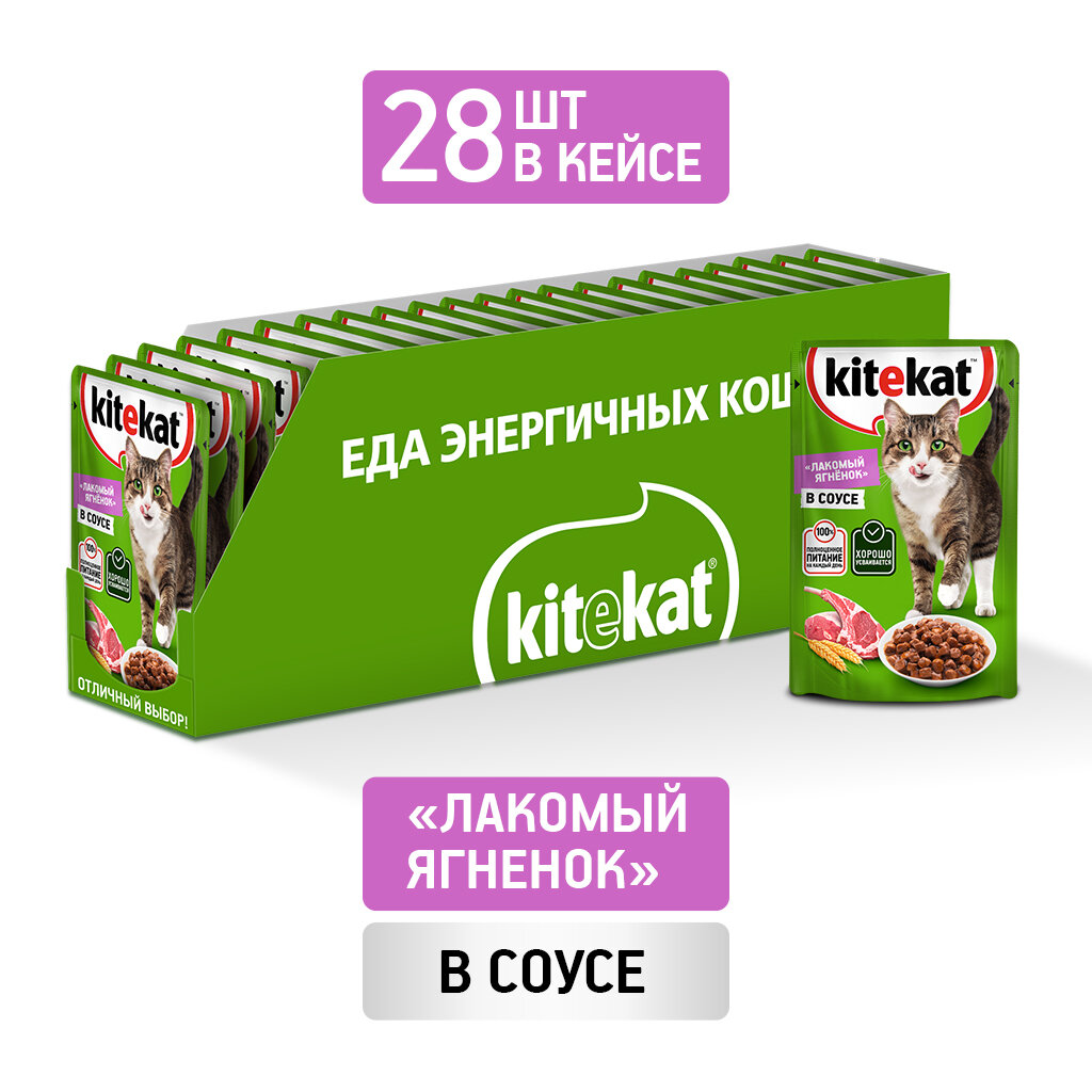 Корм для кошек влажный Kitekat для взрослых кошек, с ягненком, с соусом, 85 г × 28 шт.