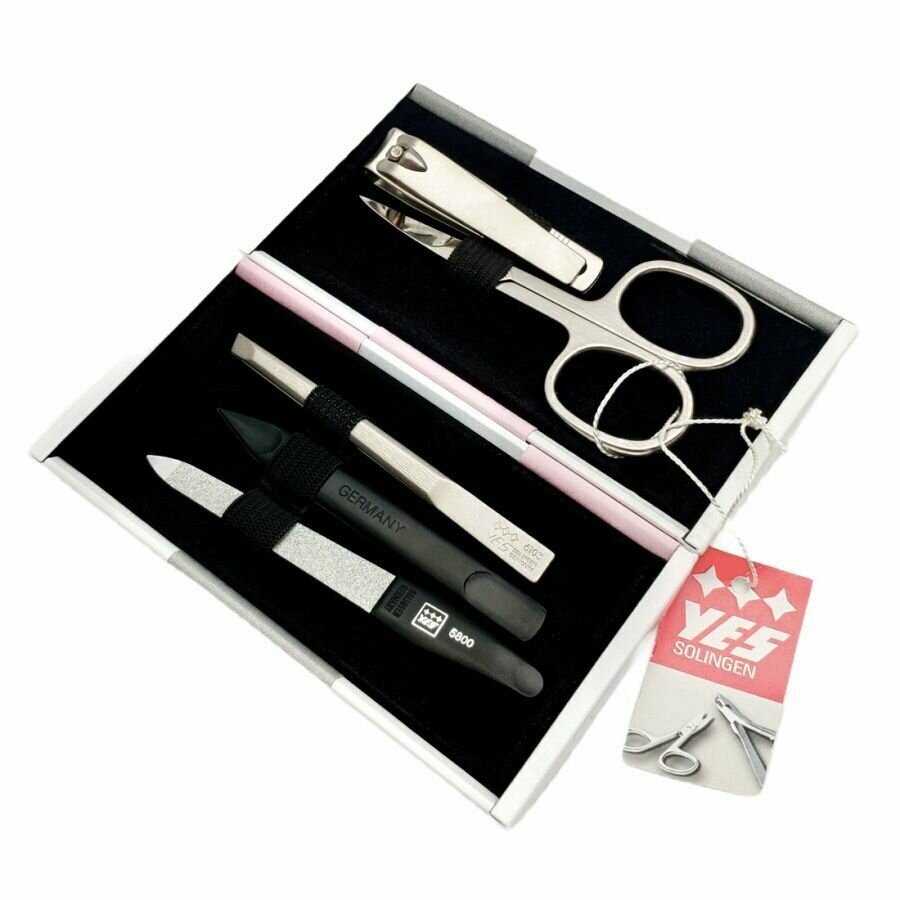 Yes Маникюрный набор 9315GAR (ножницы для ногтей + книпсер + шабер пластик + пинцет наклонный + пилка металлическая) розово-серый