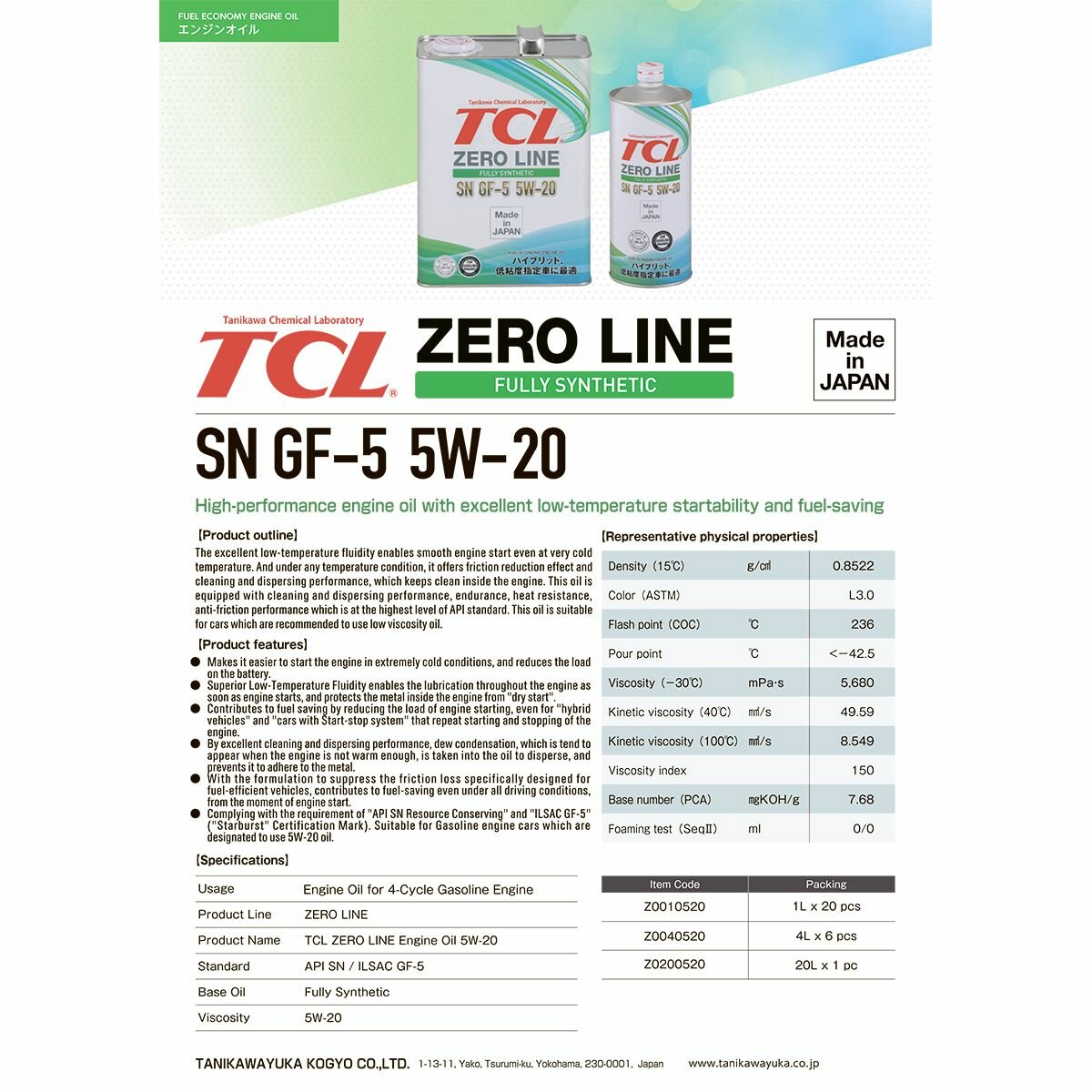 TCL Масло Моторное Tcl Zero Line Fully Synth, Fuel Economy, Sn, Gf-5, 5w20, 1л
