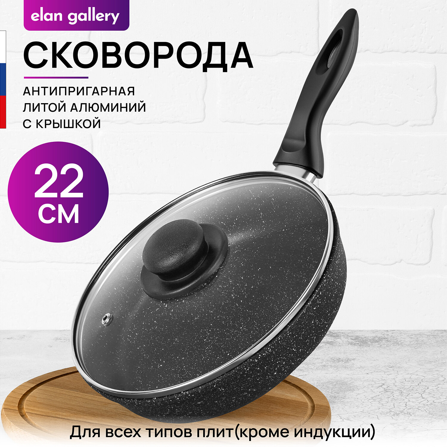 Сковорода глубокая с крышкой Elan Gallery гармония вкуса "Черный мрамор" 120221, 22см